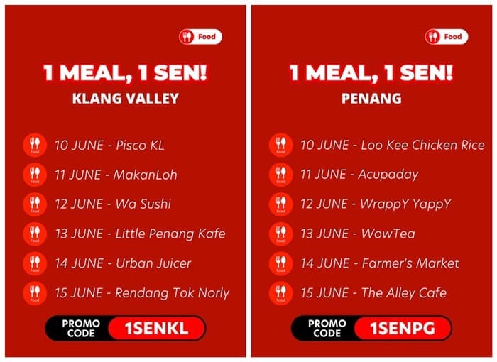 On top of the one-sen-per-meal promotion, customers will also be able to enjoy unlimited free deliveries for deliveries made within 15km from the featured restaurant of the day.