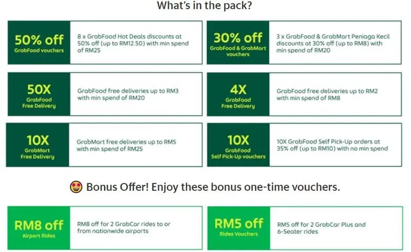 | One-time only bonus: RM8 discount for GrabCar rides to or from nationwide airports | 2x (1 pick-up and 1 drop-off) |