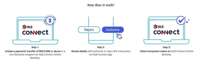 At present, the AppAuthorise feature is used to authorise only online payments or transfers of RM10,000 and above to recipients who are not saved under your Favourite List. A push notification will be sent to you when you carry out such transactions, and you can then authorise or reject them via your HLB Connect app. Meanwhile, payments that are less than RM10,000 are currently authorised using SMS TAC.