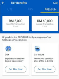 To become a Premium eWallet user, you need to make a transaction on any of the products from the e-wallet’s “Premium section” – namely, TNG eWallet’s GO+ investment feature or TNG Car Insure. Once you are upgraded to the Premium tier, you will be given the option to increase your eWallet limit to RM20,000 or keep it at RM5,000.