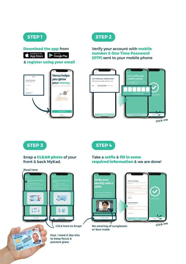 You can get started with Versa with a deposit as low as RM100, with no sales or withdrawal charges, transfer fees, or exit fees. You will have to pay an annual management fee of up to 0.3% and a trustee fee of up to 0.05%, but these are already included in the FD-like returns quoted to you by Versa. The money that you deposit into Versa will be invested into Affin Hwang’s Enhanced Deposit Fund, with returns re-deposited and re-invested until you decide to withdraw them.