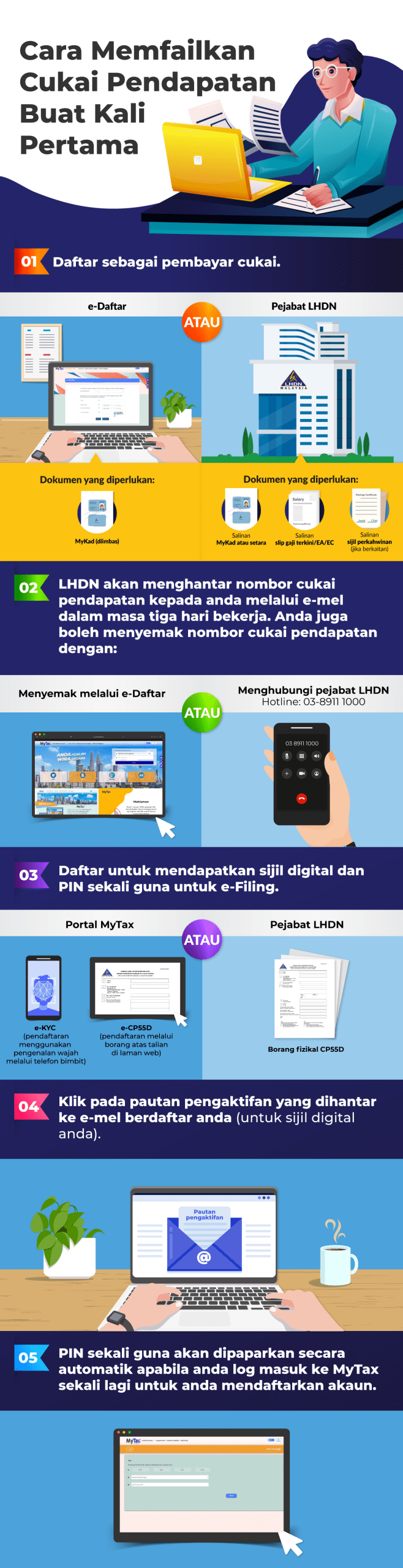 Oleh itu, jika pendapatan penggajian tahunan anda mencecah RM34,000 atau lebih, anda perlu melakukan dua perkara: daftarkan diri anda sebagai pembayar cukai melalui LHDN, dan seterusnya daftar untuk e-Filing, iaitu platform yang disediakan oleh LHDN untuk pemfailan cukai pendapatan secara dalam talian. Berikut adalah infografik yang meringkaskan langkah-langkah yang perlu diambil semasa mendaftar cukai pendapatan di Malaysia buat kali pertama: