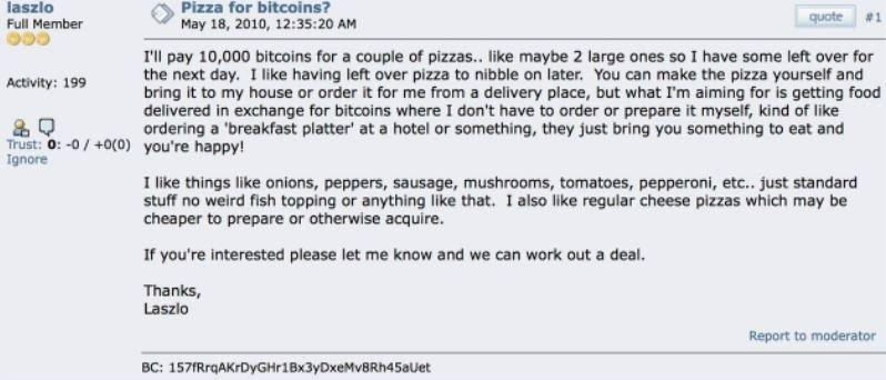 Kisahnya bermula 13 tahun yang lepas pada 22 Mei 2010, apabila seorang lelaki dari Florida bernama Laszlo Hanyecz membelanjakan 10,000 Bitcoin di sebuah restoran tempatan, Papa John’s, untuk membeli dua piza – menjadikan Hanyecz orang pertama yang melakukan transaksi “dunia sebenar” menggunakan token Bitcoin. Ini telah menempatkan namanya dalam sejarah mata wang kripto, dan peristiwa inilah yang menjadikan tarikh 22 Mei dikenali sebagai Hari Bitcoin Piza.