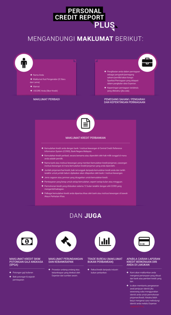 Untuk membantu anda memahami status kredit anda, agensi pelaporan kredit menyediakan laporan kredit yang mendalam kepada pengguna. Sebagai contoh, Experian Personal Credit Report Plus (PCRP) merupakan salah satu laporan kredit yang boleh anda manfaatkan. Ia akan memberikan gambaran yang meyeluruh tentang kesihatan kredit anda pada sesuatu tempoh masa serta memberikan penjelasan tentang status kredit anda. Ia juga menawarkan skor kredit tiga digit untuk rujukan mudah tentang kesihatan kredit anda – semakin tinggi angka tersebut, semakin baik kesihatan kredit anda.