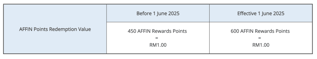 AFFIN Bank will revise the redemption value of its AFFIN Rewards Points, effective 1 June 2025. Under the new structure, cardmembers will require 600 AFFIN Rewards Points to redeem RM1.00, up from the current 450 points.
