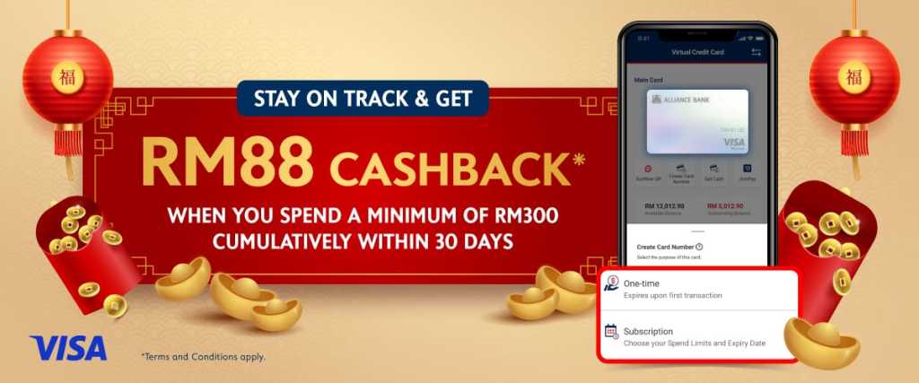 Alliance Bank is running its Virtual Credit Card RM88 Cashback campaign, which allows eligible Alliance Bank Visa Virtual Credit Card (VCC) cardholders to earn RM88 when they spend a cumulative minimum amount of RM300 within 30 days. Already ongoing, this campaign is set to continue until 30 April 2024.