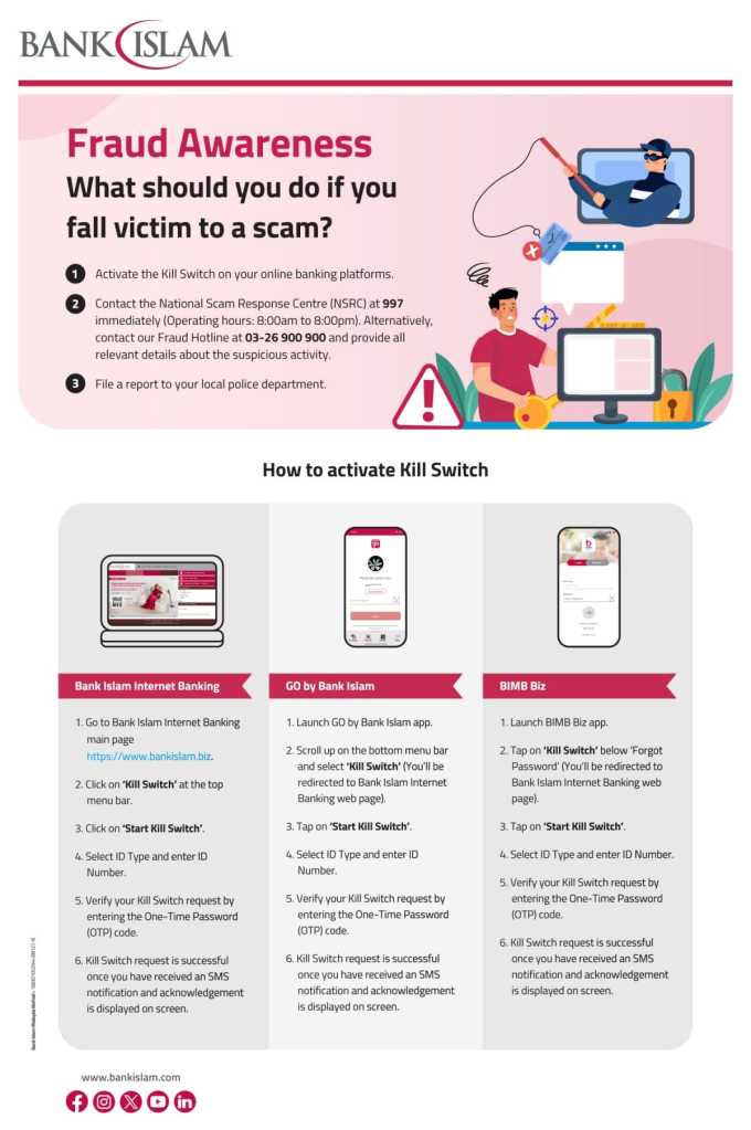 Members of the public who encounter suspicious activities involving the misuse of Bank Islam’s brand are encouraged to report them immediately to the Bank Islam Contact Centre at 03-26 900 900 or via email at [email protected].
