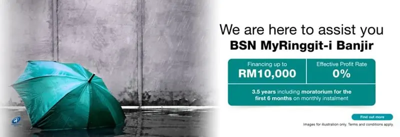 Aside from the BSN MyRinggit-i BANJIR facility, BSN also has a flood relief programme that offers help in the form of a moratorium or reduction of instalment repayment (up to six months). These are provided for house loans, hire purchase, credit cards, as well as personal loans.
