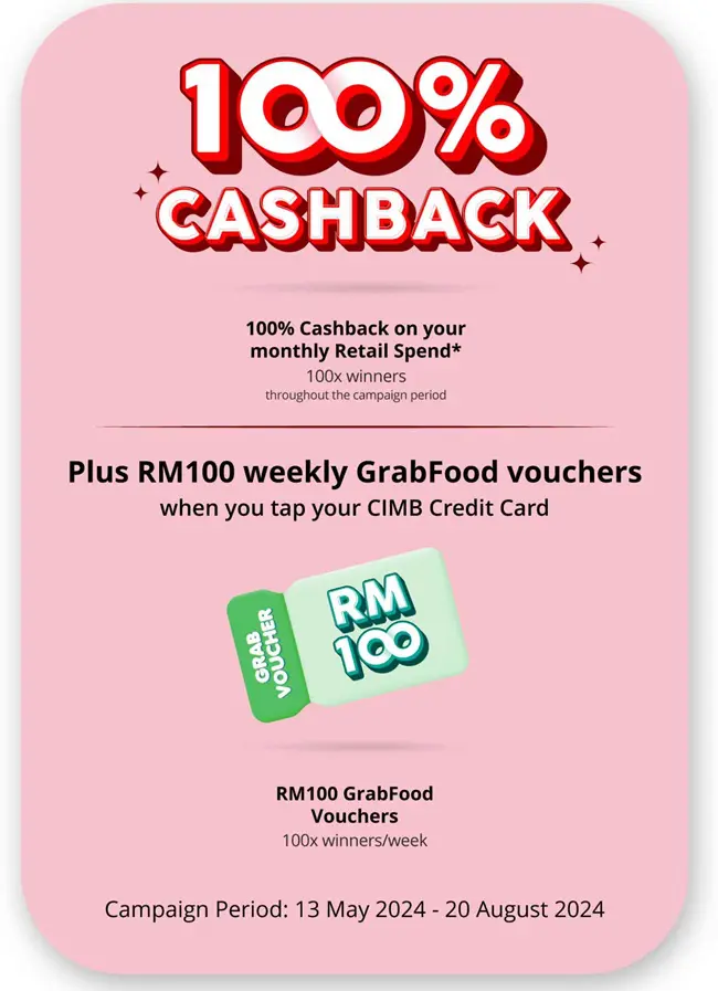 In conjunction with its 100th year anniversary, CIMB Bank is currently running its Giving You 100s campaign, where eligible credit cardholders will stand a daily chance to win 100% cashback on their monthly retail spend. Running from today until 20 August 2024, this is on top of weekly GrabFood vouchers worth RM100 that are up for grabs as well.