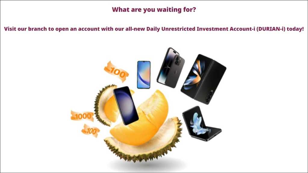 CIMB is currently running a campaign to promote the launch of its new Daily Unrestricted Investment Account-i (DURIAN-i), allowing accountholders to win exclusive monthly and year-end prizes such as an Apple iPhone 14 Pro and Samsung Galaxy Z Fold4. Already ongoing, the CIMB DURIAN-i Riuh Durian Runtuh campaign is set to run until 31 December 2023.