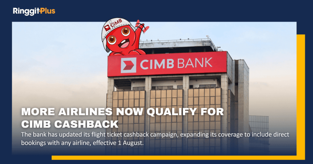 CIMB Bank Berhad has announced updates to its ongoing flight ticket cash back campaigns for eligible Visa[PDF] and Mastercard[PDF] credit cardholders. Starting 1 August 2025, a wider range of airline transactions will qualify for cash back, following changes to the campaign’s eligibility criteria.