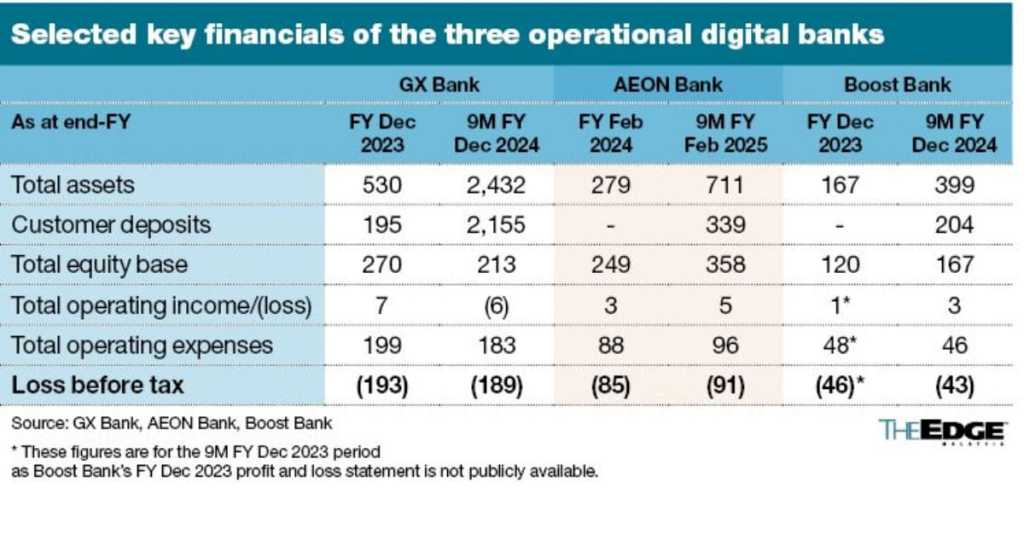 None of the three banks has reached breakeven, as anticipated, mainly due to substantial setup costs and a reliance on income from low-risk asset investments. GXBank reported a pre-tax loss of RM189 million for the nine-month period ending December 2024. AEON Bank recorded RM91 million in losses over the nine months leading up to the end of its financial year in February 2025, while Boost Bank posted RM43 million in losses for the nine-month period ending December 2024.