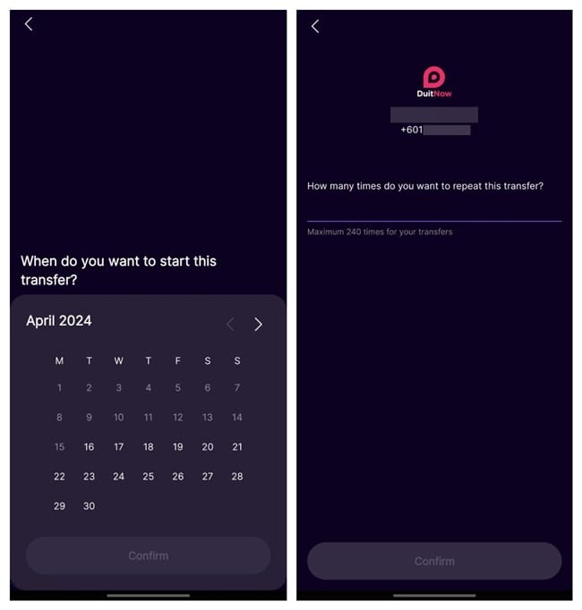 To access this feature, go ahead and tap on “Send Money” on your GXBank home screen, then select the recipient and set the type of transfer to “Schedule and automate”. You can then choose the frequency of this scheduled transfer (daily, weekly, or monthly), when to start these transfers, and the number of times you’d like to repeat the transfer (up to 240 times).