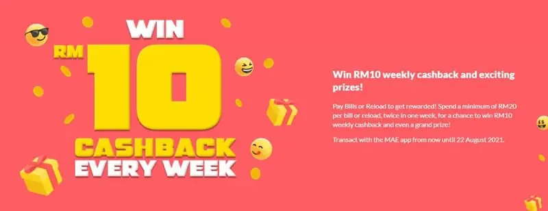 This campaign gives you the chance to earn weekly cashback rewards of RM10 when you carry out at least two bill payments or prepaid reloads during the week on the MAE app. This is on top of other additional grand and bonus prizes that you can also win when you have performed a specified number of transactions throughout the whole campaign period.