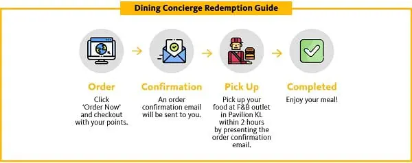 Upon successful redemption, you will be sent a confirmation email and you have two hours to pick up your food order at the relevant outlet in Pavilion KL. The dining concierge hours are between 11am to 7.30pm every day, with 5.30pm being the time for last orders. There is no minimum spend required for a food order, but this particular promotion cannot be used in conjunction with other discounts, promotions, vouchers, or privilege cards.