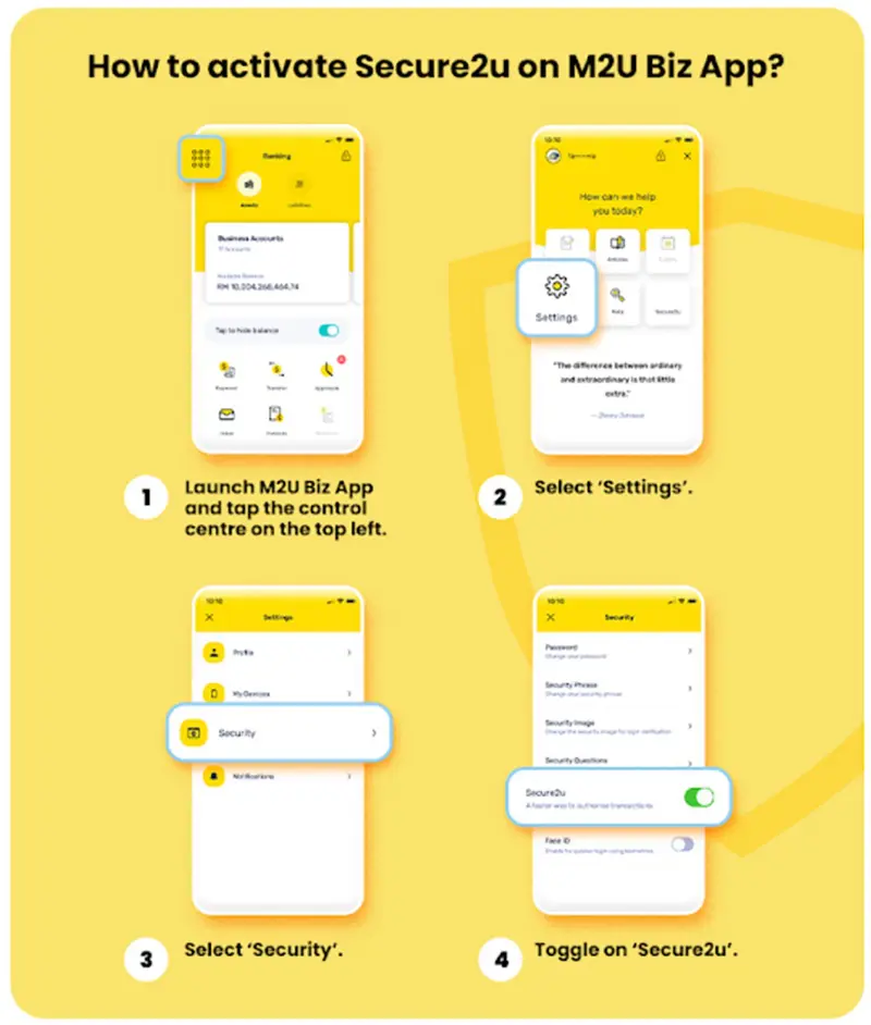 To activate Secure2u on the Maybank2u Biz app, simply fire up your app and follow these steps: