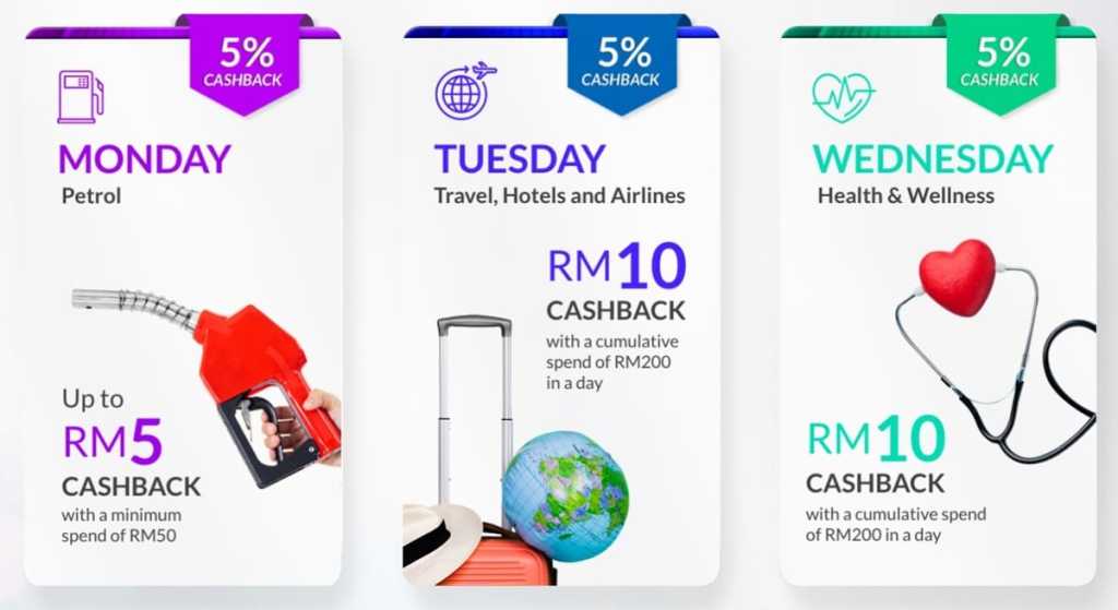 Open to all RHB credit cardholders, you’ll be able to earn cashback on a specified category of spend for each day of the week, such as petrol (Monday), travel (Tuesday), and health (Wednesday). On top of these day-specific cashback rewards, you can also get daily cashback (every day of the week) for dining, groceries, and e-commerce transactions.