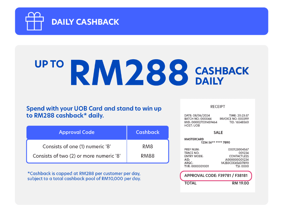 From 18 June 2024 to 2 August 2024, every UOB cardholder is entitled to earn up to RM288 in daily cashback. The mechanics are simple: if the transaction receipt’s approval code contains at least one ‘8’, you are eligible to win either RM8 or RM88. This cashback can be won multiple times daily with no minimum spend requirements, with the following conditions: