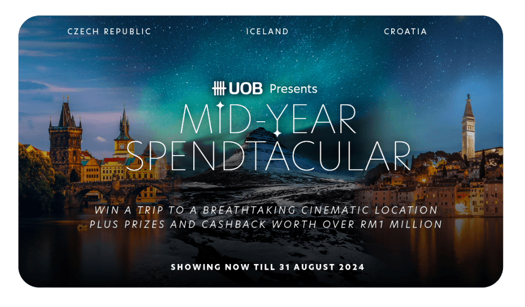 UOB Bank has launched its Mid-Year Spendtacular campaign, where UOB credit and debit cardholders can win a pool of prizes worth over RM1,000,000, including a grand prize of RM100,000 cashback, European travel packages worth RM80,000, and other monthly prizes. This campaign is set to run from now until 31 August 2024, during which there will also be up to RM288 cashback to be won daily.