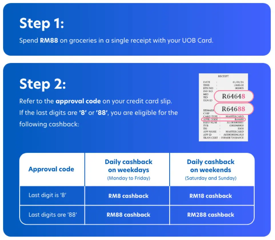 Open to all new and existing cardholders, the campaign requires you to first spend a minimum of RM88 on groceries to earn a chance at winning the daily cashback reward. Upon meeting the minimum spend requirement, check the approval code on the credit card slip that was issued when making your payment; if your code ends in either the digit “8” or “88”, then you’ll be entitled to the following amount of cashback reward – depending on whether your payment was made during weekdays or weekends: