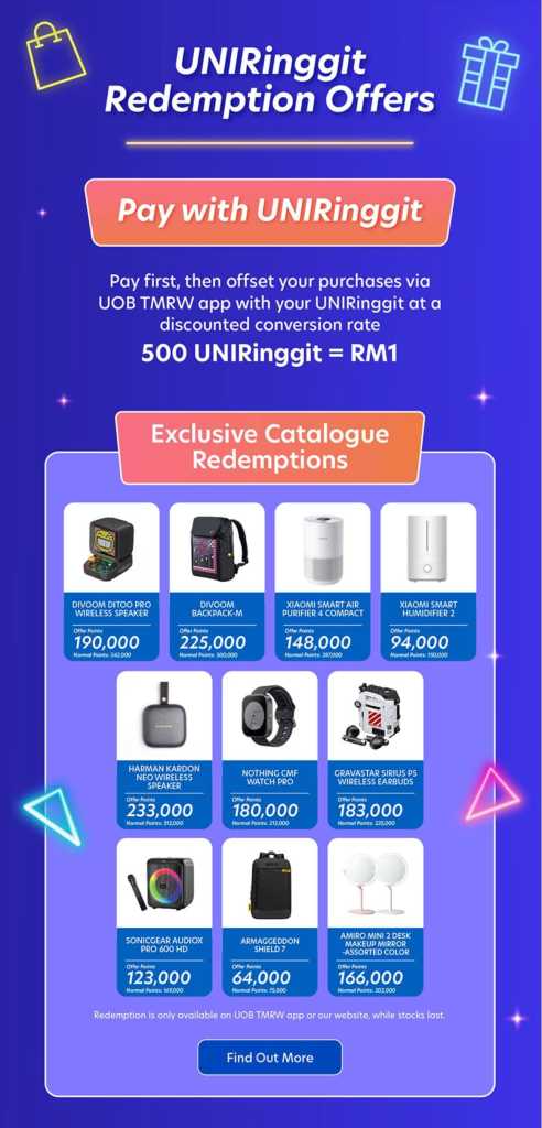 Note that for Pay with UNIRinggit, you’re required to make the full payment of your purchases first, then redeem your points later for cashback. Some items that are available via this deal include the Xiaomi Smart Air Purifier 4 Compact, Nothing CMF Watch Pro, and SonicGear AudioX Pro 600 HD speakers. You can find the full list here.