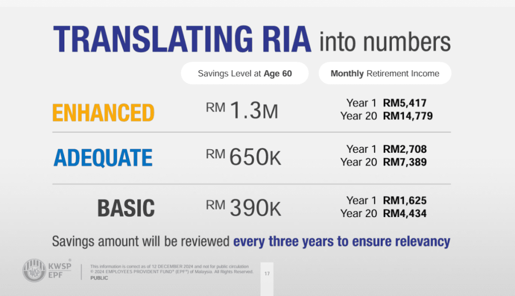 The new structure, which will take effect in January 2026, includes Basic Savings, Adequate Savings, and Enhanced Savings levels. Basic Savings, set at RM390,000 at age 60, ensures essential retirement needs are met. Adequate Savings, benchmarked at RM650,000, provides for a reasonable standard of living, while Enhanced Savings, targeting RM1.3 million, supports financial independence and a higher quality of life.