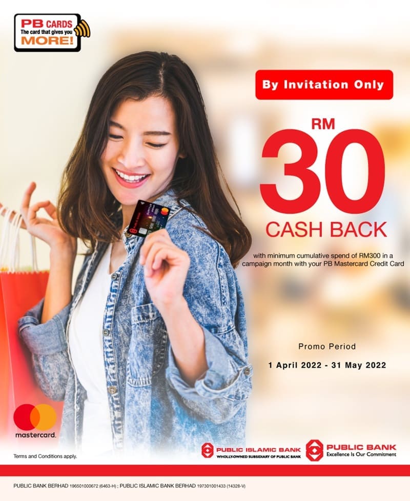 Public Bank and Public Islamic Bank are running a campaign to reward Mastercard credit cardholders with RM30 cashback when they spend a minimum cumulative of RM300 per month. Already ongoing, the campaign is set to run until 31 May 2022.