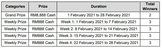 There is no limit to the number of entries that you can earn, but each eligible customer is only entitled to win only one prize during the campaign period. All winners will be selected at the end of the campaign period via an algorithm system, after which they’ll be notified via SMS, phone call, or email within four weeks. Meanwhile, the cash prizes will be credited into the winners’ current or savings account within two working days after the announcement.