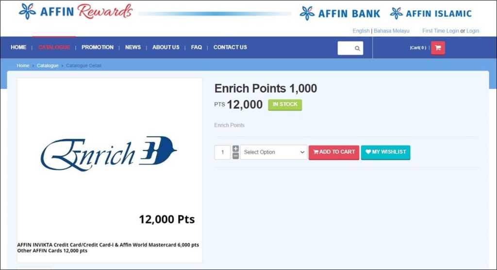 | – Affin Invikta Visa Infinite – Affin Invikta World Mastercard | 6,000 AFFIN Rewards Points = 1,000 Enrich Points/AirAsia Points/Malindo Miles | 6,000 AFFIN Rewards Points = 1,000 Enrich Points/AirAsia Points/Malindo Miles |