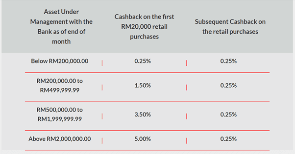 After the revision in August, cardholders will be earning cashback instead and the amount of cashback offered will be based on your monthly assets under management (AUM) with the bank, as well as the amount spent each month. Petrol, charity, and government-related transactions are not eligible for cashback.