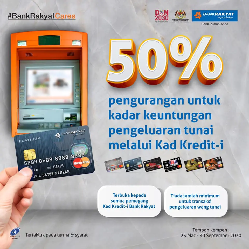 Bank Rakyat is offering a 50% discount off credit card cash advance profit rates as part of its Bank Rakyat Cares campaign. Eligible Bank Rakyat credit cardholders can make a cash withdrawal at a profit rate of 9% p.a. instead of the usual 18% p.a. until 30 September 2020.