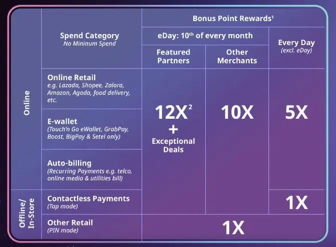 On eDays, you’ll earn 12x BP for online retail, e-wallet, and auto-billing transactions, as well as contactless payments made in store – if you shop with a featured merchant partner. For all other merchants, you’ll earn 10x BP. Meanwhile, online retail, e-wallet, and auto-billing expenses on ordinary days will net you 5x BP, whereas contactless payments will get you 1x BP. For other offline retail expenses, you’ll get 1x BP, regardless of whether you spend on the special eDay or ordinary days.