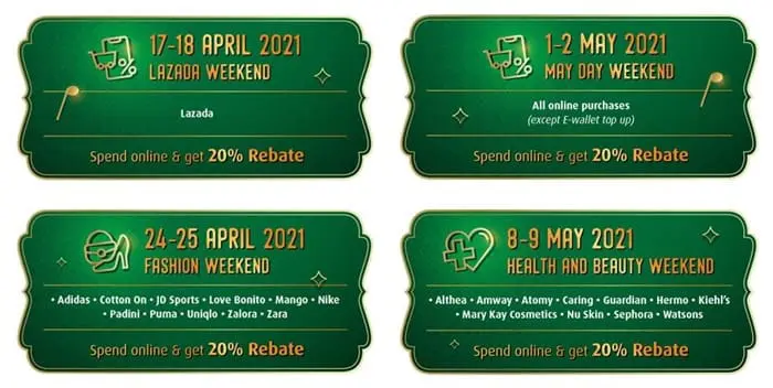 Between today until 30 May 2021, Hong Leong Bank (HLB) will be running its Hari Raya Online Weekend Special campaign, where credit cardholders can earn a 20% rebate when they make online purchases from featured brands with their credit cards during weekends. Even better, you do not need to fulfil any minimum spending requirement to be eligible for this promotion.