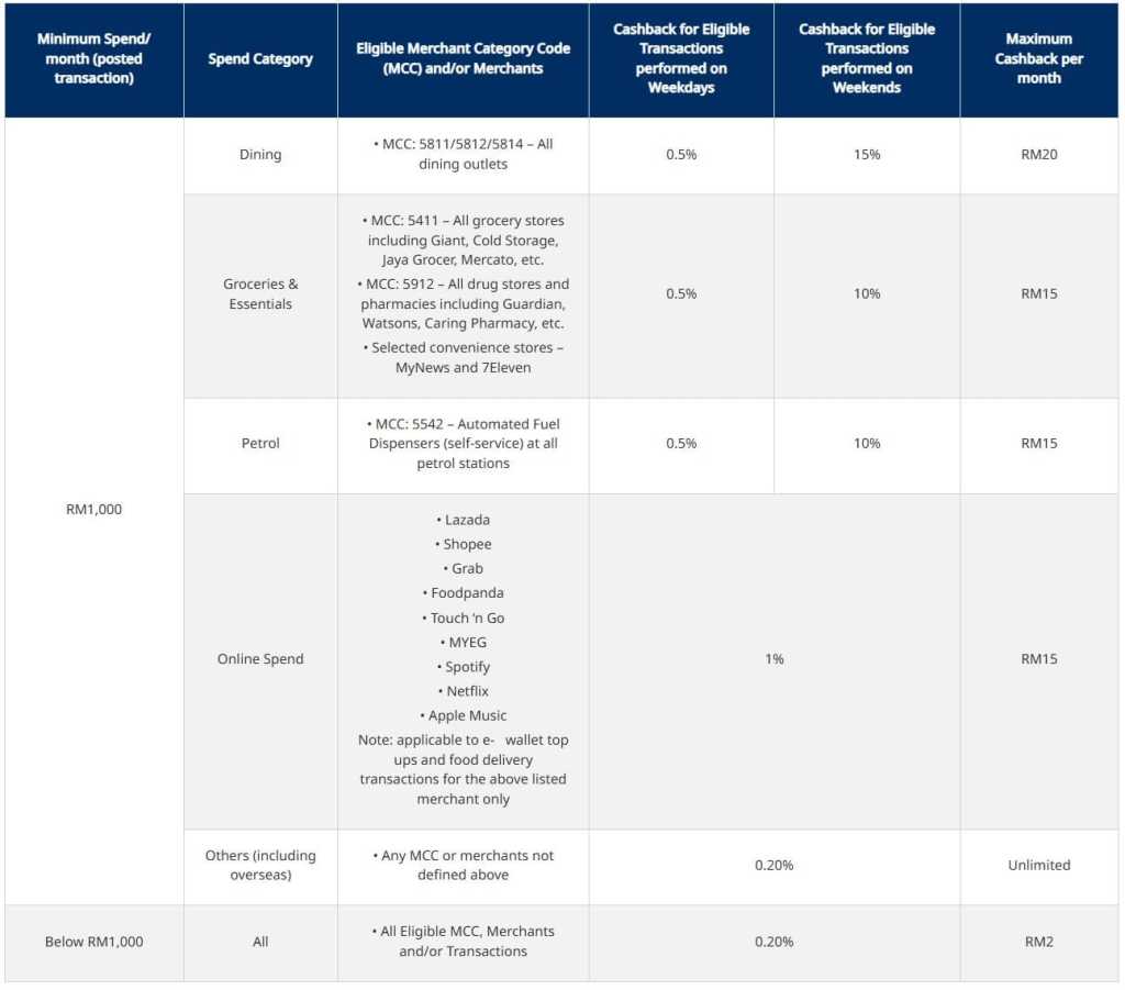 The new changes, which will come into effect from 1 January 2025, will increase the weekend cashback rate for some spend categories to up to 15% as well as the maximum cashback for Dining category. On the other hand, the minimum monthly spend requirement to unlock the highest cashback rates has been increased from RM500 to RM1,000, and the weekday cashback rate revised from 1% to 0.5%.