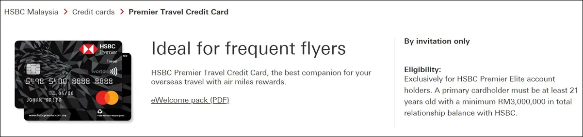 HSBC Bank has revised the eligibility criteria to obtain its HSBC Premier World Travel Mastercard credit card, increasing the original requirement of having a minimum total relationship balance (TRB) of RM200,000 with the bank to RM3 million. On top of that, this card is now also a by-invitation-only card, available exclusively for HSBC Premier Elite accountholders.