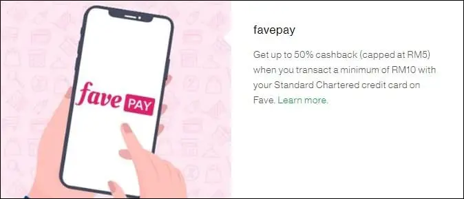 Firstly, there is a FavePay promo that lets you earn 20% cashback when you spend a minimum of RM10 with your Standard Chartered credit card on the e-wallet. Capped at RM5, this means you will be able to earn cashback for transactions of up to RM25.