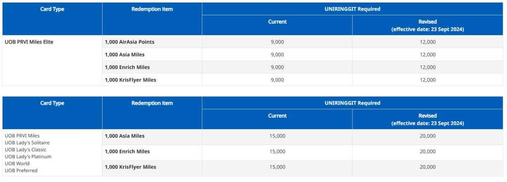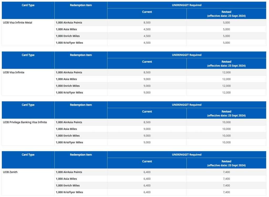 The revisions will see anywhere between 11% to 33% higher UNIRM required to redeem 1,000 air miles from the four frequent flyer programmes available: AirAsia Points, Enrich, KrisFlyer, and Asia Miles. There is an outlier, however: for the UOB Visa Infinite Metal, the AirAsia Points redemption rate is enhanced from 8,500 UNIRM to 5,000 UNIRM (though the prevailing opinion is that the other frequent flyer programmes offer considerably higher value). Here’s the full list of changes: