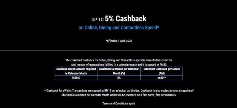 UOB YOLO cardmembers are currently able to earn 5% cashback on Online, Dining, and Contactless expenses, capped at a maximum of RM30 per month. This is provided you meet the qualifying criteria of making at least five transactions each month (minimum spend of RM15 each transaction).