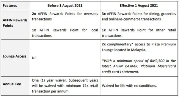 Affin Bank is updating the benefits of the Affin Islamic Platinum Mastercard to reward its credit cardholders with improved incentives. Effective from 1 August 2021, the enhanced features include a revised AFFIN Rewards Points earning system, the provision of complimentary access to the Plaza Premium Lounges within Malaysia, and a lifetime waiver of the annual fee.
