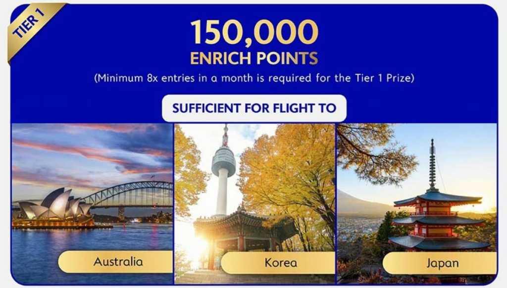 | 1 | 150,000 Enrich Points (sufficient for return flights to destinations such as the UK, Australia, Japan, and Korea) | First three cardholders to earn minimum 8x entries | – 3 winners per month – 18 winners throughout whole campaign period |