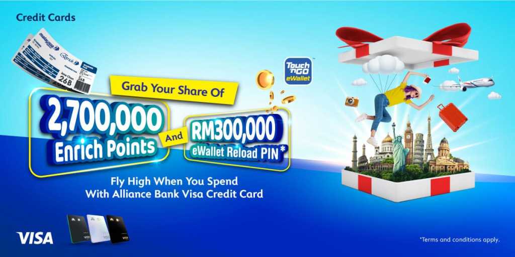Alliance Bank is currently running its Fly High With Alliance Bank Visa Credit Cards campaign, allowing eligible Visa credit cardholders the chance to win 150,000 Enrich Points or RM100 Touch ‘n Go (TNG) eWallet reload PINs. Set to continue until 30 September 2023, the campaign requires you to spend and earn a minimum number of entries as quickly as possible in order to win the prizes.
