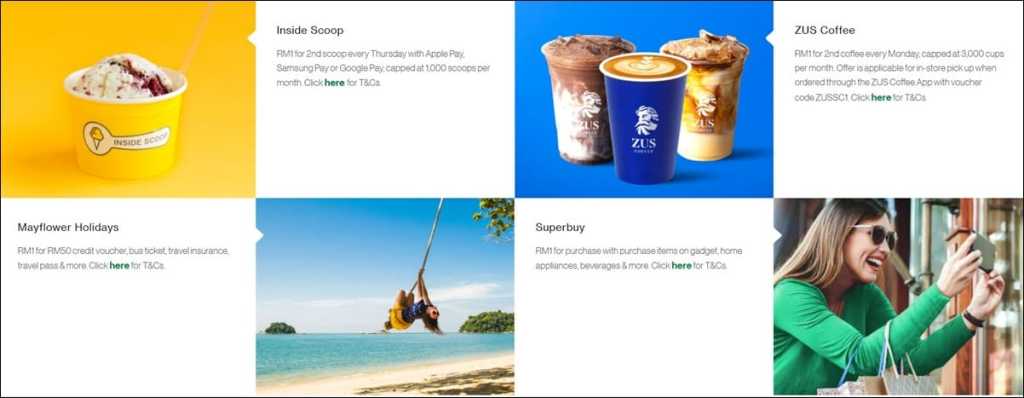 Open to both new and existing credit cardholders, notable brands that are participating in this campaign include eateries like Inside Scoop, ZUS Coffee, and EL&N London. There are also RM1 promos for selected products or services by companies like shipping agent Superbuy and tour agency Mayflower Holidays.