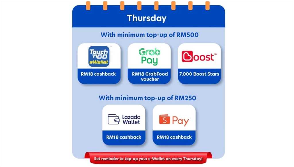 | TNG eWallet | RM18 cashback | Minimum reload of RM500 in a single transaction | 600 redemptions (first-come first-served) | Within 10 working days from end of each month |