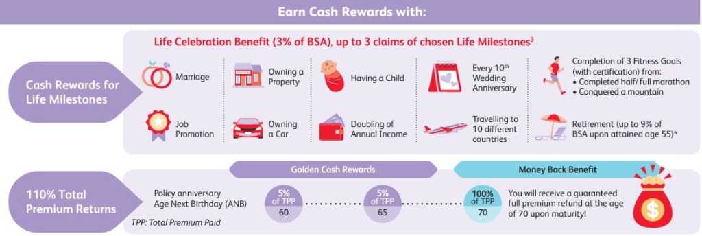 In addition to these, there are also other perks that are on offer, including the Life Celebration Benefit, where policyholders are rewarded with up to 3% of their basic sum assured when they celebrate one out of ten key milestones in life (claimable up to three times). These include the purchase of your first property, a career promotion, and marriage.