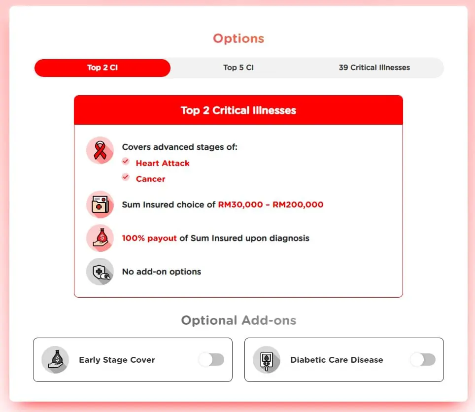 | Top 2 Critical Illnesses | Advanced stages of: – Heart attack – Cancer | Between RM30,000 to RM200,000 | 100% payout of sum insured upon diagnosis |