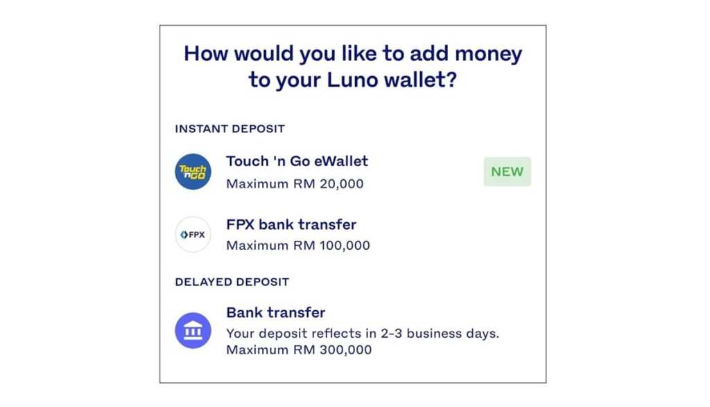 While it’s not certain when exactly this latest update by Luno was launched, it is a fairly recent one. Prior to this, Luno investors were only allowed to make deposits via bank transfers (with the transaction taking two to three business days) and FPX bank transfers (instantly reflected).