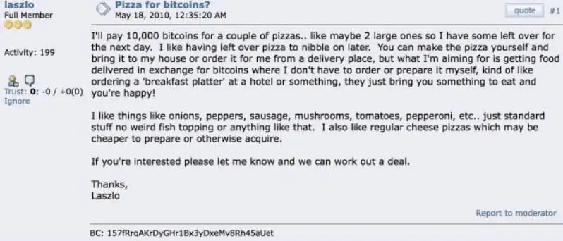 Well, first, the story: 12 years ago on 22 May, a man from Florida named Laszlo Hanyecz spent 10,000 Bitcoin at a local restaurant, Papa John’s to buy himself two pizzas – making him the first person to perform a “real-world” transaction with the token. Understandably, this has now earned him a spot in the history of cryptocurrency, and it is also why 22 May is now famously known as Bitcoin Pizza Day.