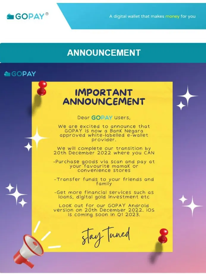 Payment platform GOPAY announced that it has been approved by Bank Negara Malaysia (BNM) as a white-label e-wallet service provider. It expects to complete its transition and roll out the updated GOPAY app (Android version) by 20 December 2022, while the iOS version is set to be made available in the first quarter of 2023.
