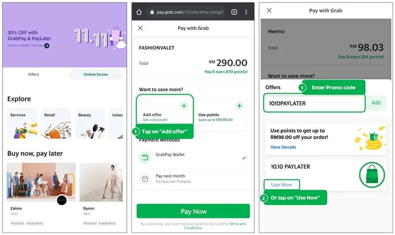 | PayLater by Grab | 30% off, capped at RM50 | 1111PAYLATER | 7,000 redemptions |