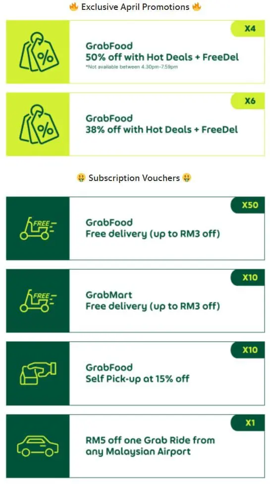 Let’s first start by checking out the updated plan itself. Grab has been tweaking the subscription plan and for April, Grab updated its GrabUnlimited plan to be more affordable, and includes two types of vouchers: promotions of the month, and the standard subscription vouchers. For 1 sen in the first month (for new users) and RM4.90 for subsequent months, you get: